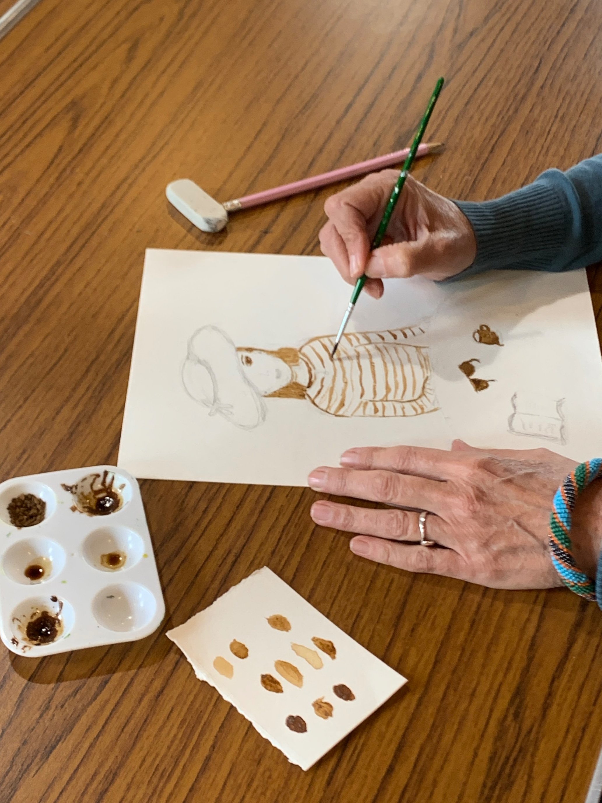 Discover the beauty of painting with coffee in this calming and creative workshop. You’ll be introduced to the unique “coffee painting technique” and guided step-by-step to create your own portrait using this rich, natural pigment.